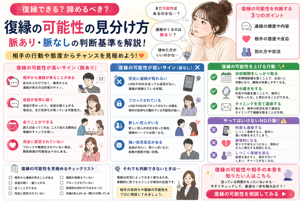 結論:復縁の可能性は「連絡状況・別れ方・相手の態度」で判断できるが、慎重に見極めることが重要です。