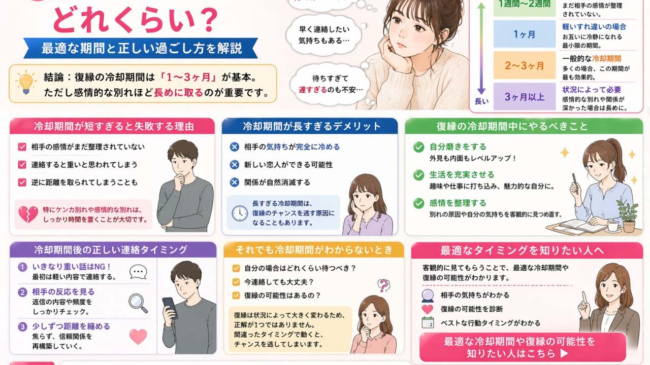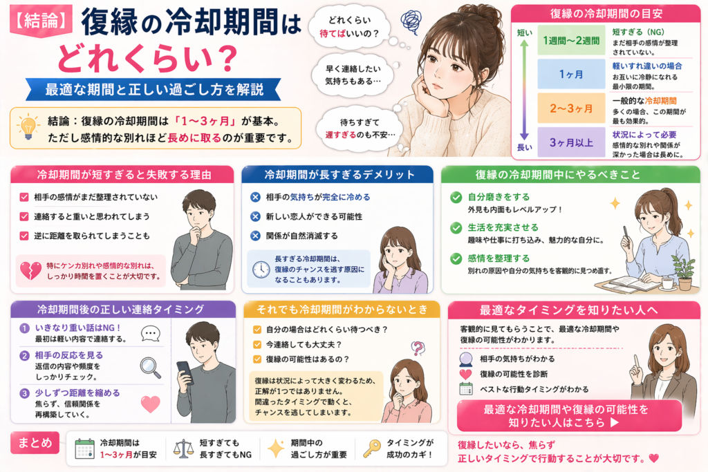 結論:復縁の冷却期間は「1〜3ヶ月」が基本。ただし感情的な別れほど長めに取るのが重要です。